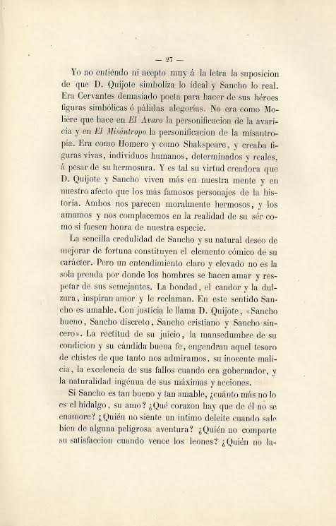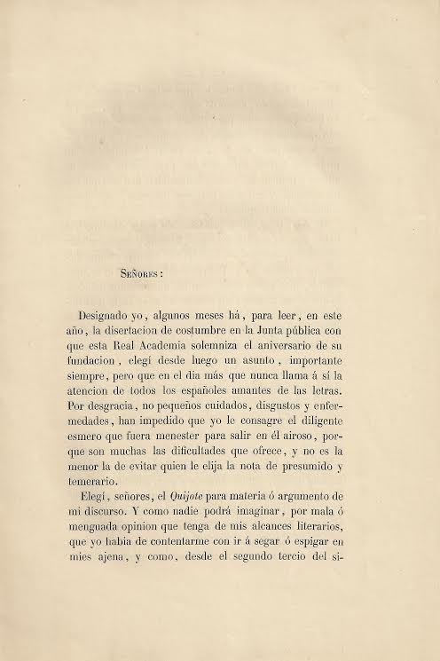 Sobre el Quijote y sobre las diferentes maneras de comentarle y juzgarle: discurso leido por el señor Don Juan Valera, individuo de número de la Real Academia Española en la junta pública para solemnizar el aniversario de su fundacion celebró dicho cuerpo literario, en cumplimiento del Art. XXVIII de sus estatutos el dia 25 de setiembre de 1864.-- Madrid : [s.n.], 1864 (Imprenta de Manuel Galiano)