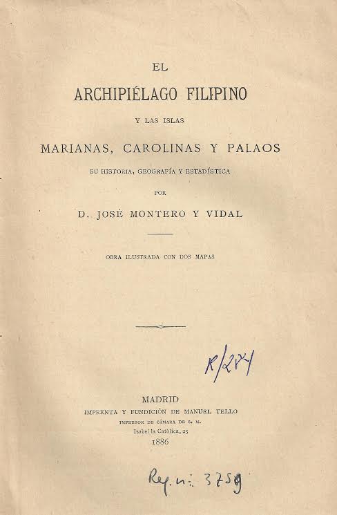 El Archipielago Filipino y las islas Marianas, Carolinas y Palaos: su historia, geografia y estadistica / por José Montero Vidal.-- Madrid : [s.n.], 1886 (Imprenta y Fundición de Manuel Tello)