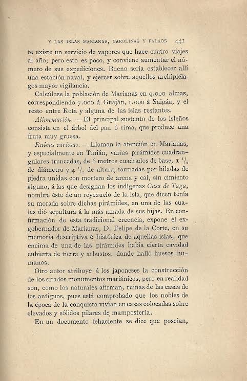 Alude en Islas Marianas al egabrense Felipe María de la Corte Ruano Calderón, gobernador desde el 16 de mayo de 1855 al 28 de enero de 1866, al referirse a las ruinas curiosas de varias pirámides cuadrangulares truncadas, que algunos atribuyen su construcción a los japoneses.