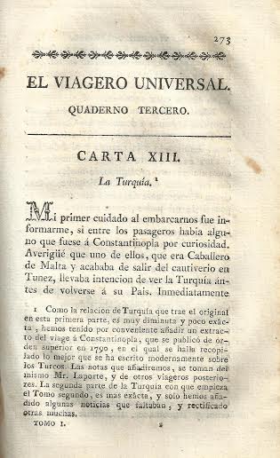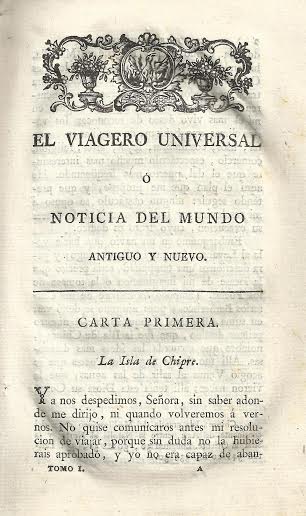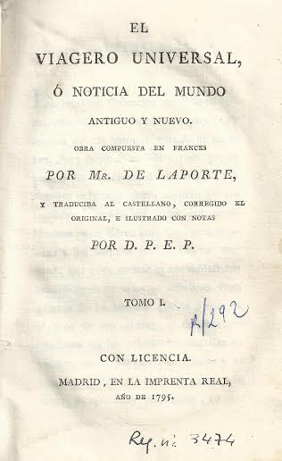 El viagero universal, ó noticia del Mundo antiguo y nuevo / obra compuesta en frances por Mr. de Laporte ; y traducida al castellano, corregido el original, e ilustrado con notas por D.P.E.P. ; tomo I.-- Madrid : en la Imprenta Real, 1795.