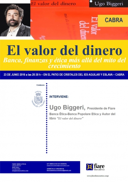 actualidad 27.06.16 Conferencia sobre banca ética El jueves, 23 de junio de 2016, intervino en la Fundación Aguilar y Eslava, Ugo Biggeri, presidente de la entidad italiana Banca Popolare Etica, que disertó sobre "El valor del dinero. Banca, finanzas y ética más allá del mito del crecimiento económico", presentando el libro del que es autor. El acto estaba organizado por Fiare Banca Etica una iniciativa que pretende ser una herramienta al servicio de la transformación social a través de la financiación de proyectos de la economía social y solidaria y la promoción de una cultura de la intermediación financiera, bajo los principios de la transparencia, la participación, la democracia y el crédito como derecho.