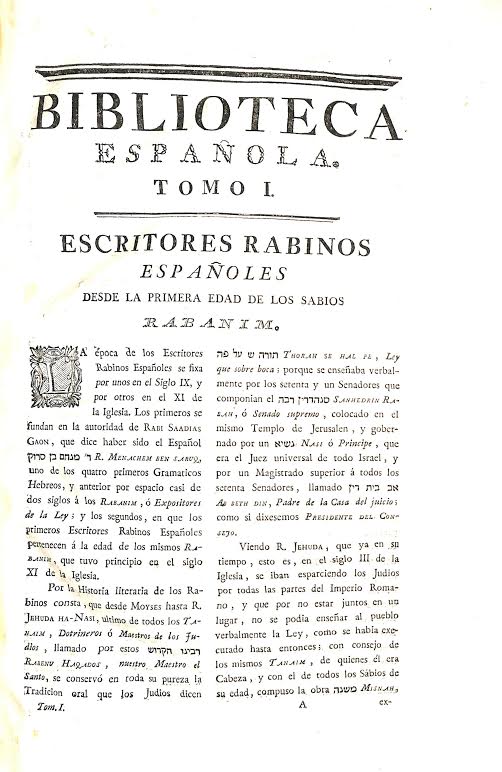 Nuestro Libro de la Semana es el primer tomo (Madrid, 1781) del proyecto de edición de una ambiciosa Biblioteca Española cuya autoría corresponde a José Rodríguez de Castro. El objetivo de este número que iniciaba la colección era hacer una gran reseña bibliográfica de la producción rabínica española, aunque en su recepción recibió importantes críticas. Resultó muy significativo que un año antes se imprimiera la reedición de las Bibliotecas de Nicolás Antonio (Sevilla, 1617; Madrid, 1684), célebre erudito e iniciador de la Bibliografía española moderna.