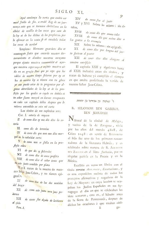 La serie de escritores rabinos españoles empieza por el siglo XI de la Iglesia, porque, dice, “con él comenzaron a escribir varias exposiciones y comentarios a los cánones del Talmud y diferentes acciones de filosofía, jurisprudencia, medicina y otras facultades”. El Talmud recoge principalmente las discusiones rabínicas sobre leyes judías, tradiciones, costumbres, narraciones y dichos, parábolas, historias y leyendas.