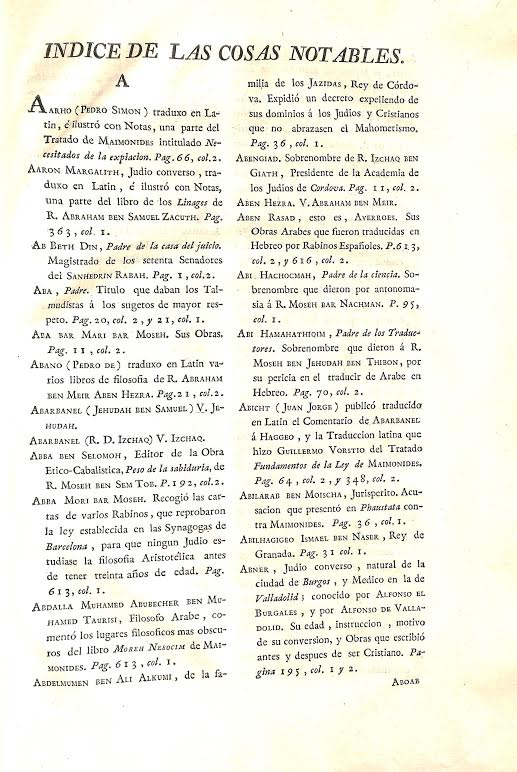 También localizamos inventarios de los escritores rabinos españoles por orden alfabético, por patrias y detalle de los conversos; asimismo de los rabinos españoles que escribieron en árabe. En la parte final aparecen: Trovadores españoles contenidos en la colección del judío converso Juan Alfonso de Baena; Traducciones españolas (manuscritas e impresas) de toda la Biblia y las de algunos de sus libros; Obras de rabinos españoles en hebreo y Obras de escritores rabinos españoles en castellano y otras lenguas. Por último, un índice de las cosas notables.