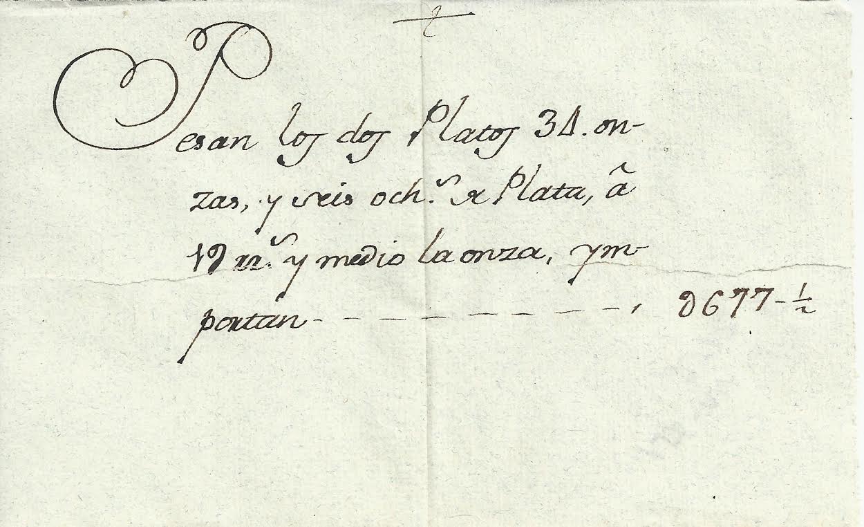 En la catalogación hallamos una cápsula del tiempo entre sus páginas, un trozo de papel (9,50x15,00 cm), un poco rajado, con texto manuscrito: “Pesan los dos platos 34 onzas y seis ochavas de plata, a 19 rs. y medio la onza, importan… ¿677,5”.