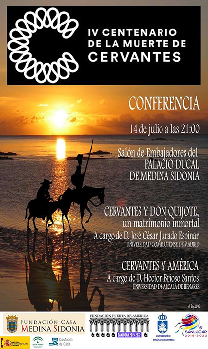 actualidad 18.07.16 Acto cervantino de la Fundación Puerta de América En el marco de los actos conmemorativos del IV Centenario de la muerte de Cervantes, la Fundación Puerta de América, nuestra fundación hermana de Sanlúcar de Barrameda, en colaboración con la Fundación Casa de Medina Sidonia organizó el jueves, 14 de julio una conferencia en la que intervinieron: José César Jurado Espinar, de la Universidad Complutense de Madrid, y Héctor Brioso Santos, de la Universidad de Alcalá de Henares. La presentación corrió a cargo de Francisco Pacheco Isla, presidente de la Fundación Puerta de América.