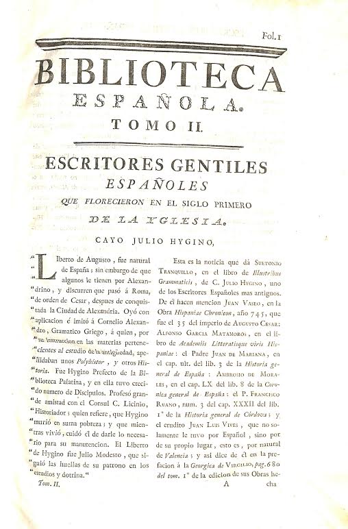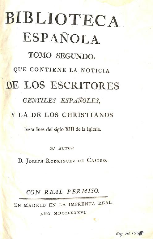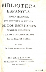 Biblioteca española : tomo segundo que contiene la noticia de los escritores gentiles españoles y la de los Christianos hasta fines del siglo XIII de la iglesia / su autor D. Joseph Rodriguez de Castro.-- En Madrid : en la Imprenta Real, 1786.