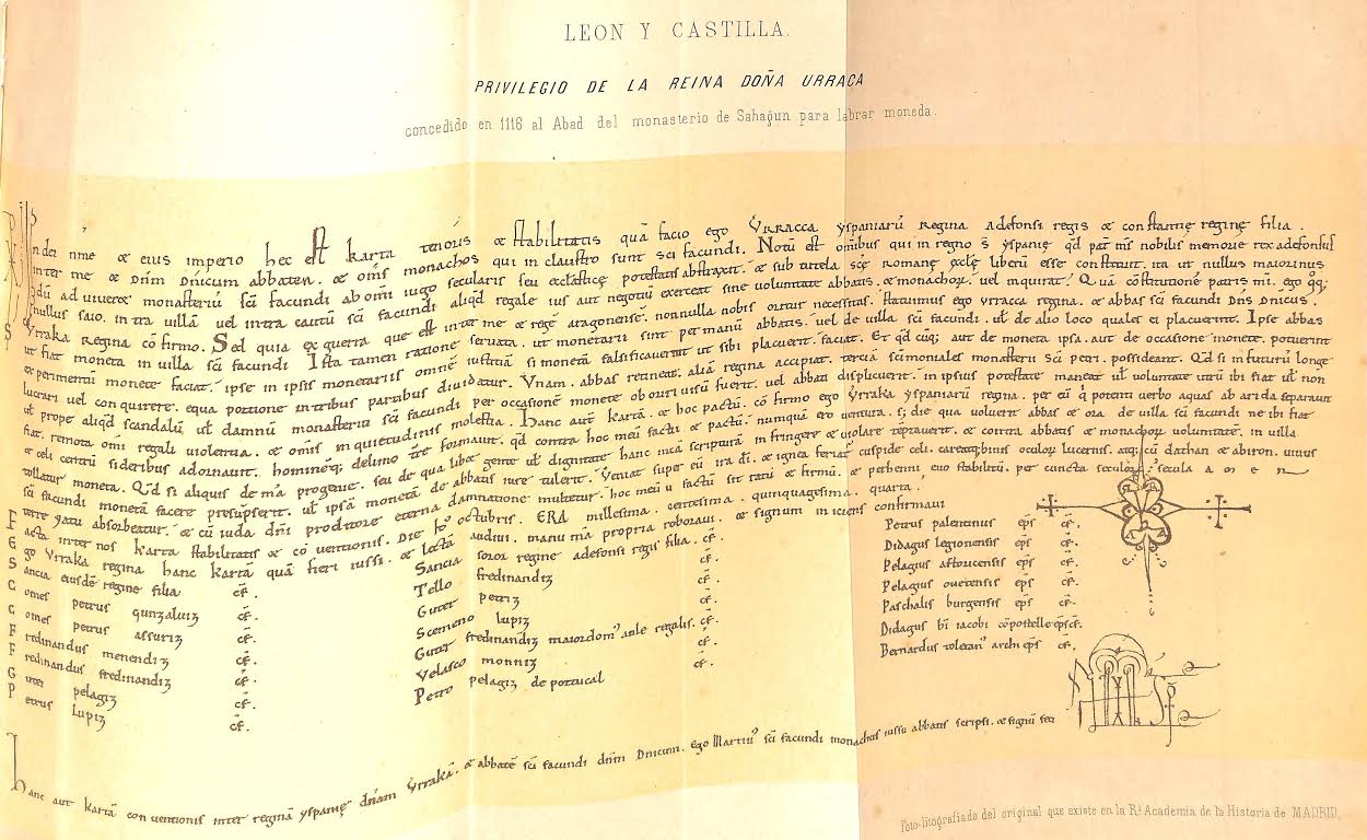 El primer tomo (1865) está dedicado a León y Castilla, con una lista cronológica de los reyes de Asturias, Oviedo, León y Castilla. En sus apartados están la separación de los dos reinos y de las dos coronas. De la Monarquía española habla de la Casa de Austria y de la Casa de Borbón. También de las casas de moneda de los reyes de Castilla y León, desde Alfonso VI hasta Carlos V, incluso de las casas de moneda de América. Siguen los documentos justificativos, que resultan muy interesantes. Hay un índice general de las cosas más notables contenidas en este tomo y, por último, una tabla de materias.