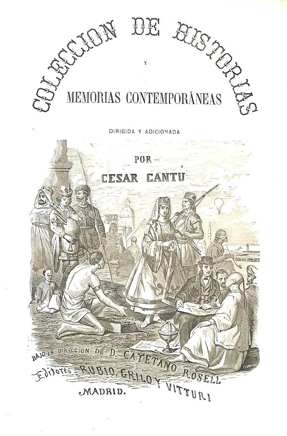 “Colección de Historias y Memorias Contemporáneas” dirigida y adicionada por César Cantú (Madrid, 1865-1867) Nos acercamos a los anaqueles de la Biblioteca Histórica Aguilar y Eslava para seleccionar entre sus ejemplares la COLECCIÓN DE HISTORIAS Y MEMORIAS CONTEMPORÁNEAS dirigida y adicionada por César Cantú (Madrid, 1865-1867), cuyo título constituye nuestro Libro de la Semana. Son tres volúmenes, encuadernados en holandesa: pastas de cartón forradas en tela azul y con el lomo de cuero en verde, en el que destaca en letras doradas que se trata de un “Donativo de Don Manuel de Vargas y Alcalde al Instituto y Real Colegio de Cabra”.El donante, gran mecenas de la Fundación, es el antiguo catedrático de dichos Colegio e Instituto y sobrino del ilustre fundador, el licenciado don Luis de Aguilar y Eslava. Además es el autor de la “Reseña Histórica del Real Colegio de Estudios Mayores de la Purísima Concepción […] y de su Instituto Provincial de Segunda Enseñanza” (Sevilla, 1879).
