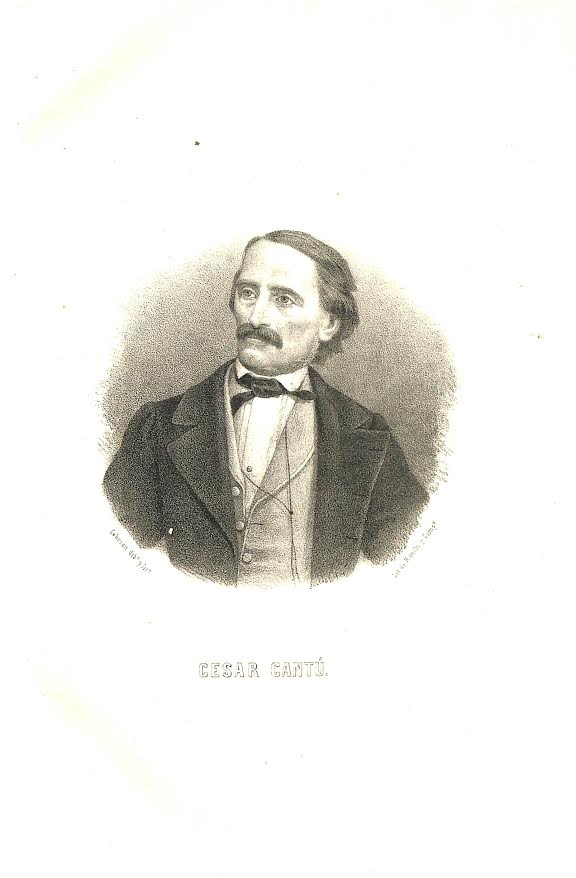 CÉSAR CANTÚ (Brivio, Como, 1804-Milán, 1895) fue un historiador, escritor y político italiano. Participó en la Joven Italia y fue miembro del gobierno provisional de Milán. Es autor de una HISTORIA UNIVERSAL, publicada en 1837, cuyos volúmenes forman parte del fondo bibliográfico antiguo y también del COMPENDIO DE LA HISTORIA UNIVERSAL, del cual nos hemos ocupados en esta reseña.