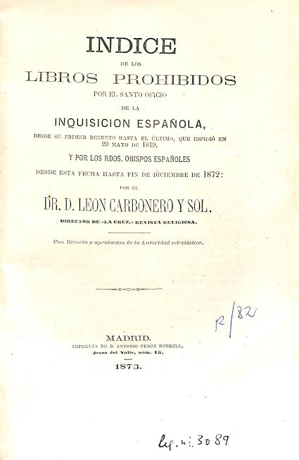 “Índice de los libros prohibidos por el Santo Oficio de la Inquisición Española” por León Carbonero y Sol (Madrid, 1873)