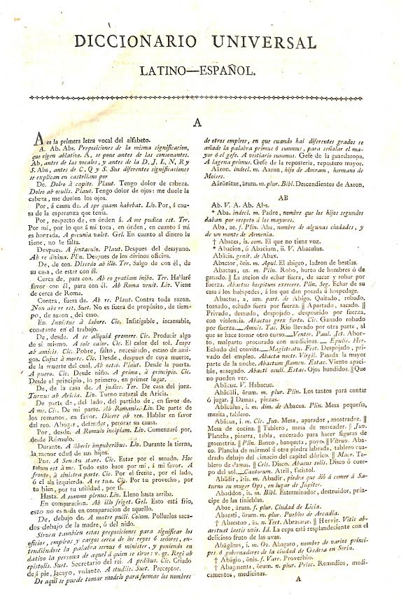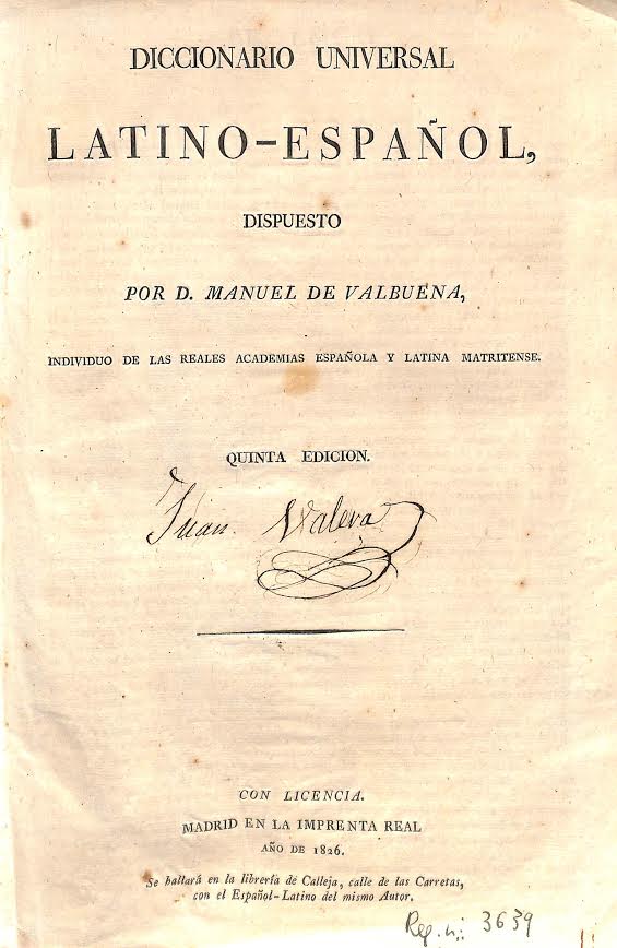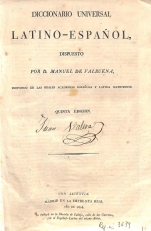 Diccionario universal latino-español / dispuesto por D. Manuel de Valbuena, individuo de las Reales Academias Española y Latina Matritense.-- Quinta Edición.-- Con Licencia: Madrid. En la Imprenta Real. Año de 1926.-- Se hallará en la librería de Calleja, calle de las Carretas, con el Español-Latino del mismo autor.