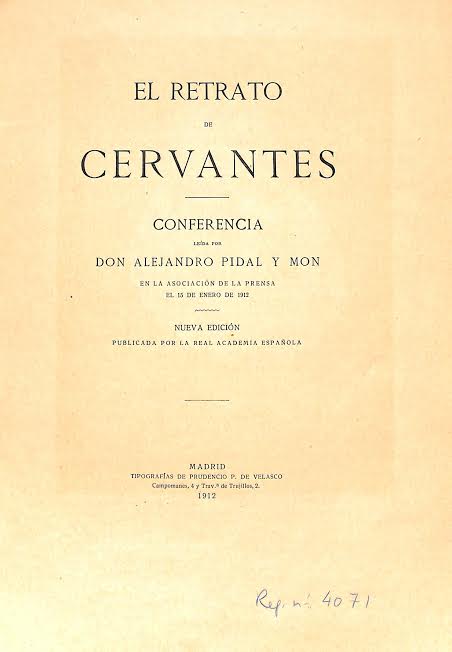 El retrato de Cervantes : conferencia leída por Alejandro Pidal y Mon en la Asociación de Prensa el 15 de enero de 1912.-- Nueva ed. publicada por la Real Academia Española.-- Madrid : [s.n.], 1912 (Prudencio P. de Velasco)