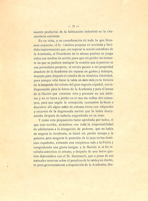 En su conferencia Alejandro Pidal relata todos los pormenores en la consecución del cuadro, ya que el objetivo principal era que el retrato pasara a ser propiedad absoluta de la Academia “sin reparar en gastos y trabajos, dejando para después el estudio de su histórica identidad “y no se fuera a perder en el mar sin orillas del extranjero, para que según la envejecida costumbre la fuese a descubrir allí algún sabio de extraña tierra con vilipendio y escarnio de la degenerada nación que la había desconocido después de haberla engendrado en su seno”.