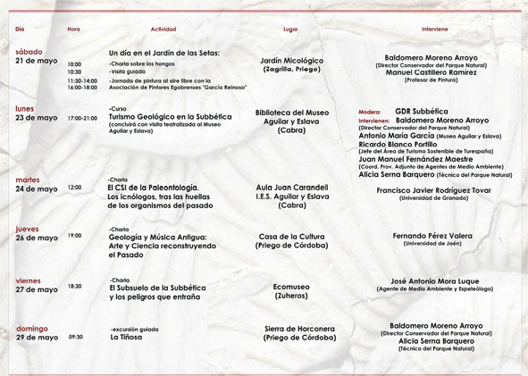 Por otra parte, del 21 de mayo al 5 de junio, el Instituto y el Museo Aguilar y Eslava participarán en la Semana de los Geoparques Europeos y el Parque Natural Sierras Subbéticas. Así entre muchas otras actividades, el próximo día 23 de mayo, en la Biblioteca del IES Aguilar y Eslava se celebrará un Curso de “Turismo Geológico en la Subbética” y a su término los participantes tendrán una visita teatralizada al Museo Aguilar y Eslava. Al día siguiente, 24 de mayo, en el Aula “Juan Carandell” del Museo Aguilar y Eslava se impartirá una charla para estudiantes sobre “El CSI de la Paleontología. Los icnólogos, tras las huellas del pasado” por Francisco Javier Rodríguez Tovar de la Universidad de Granada.