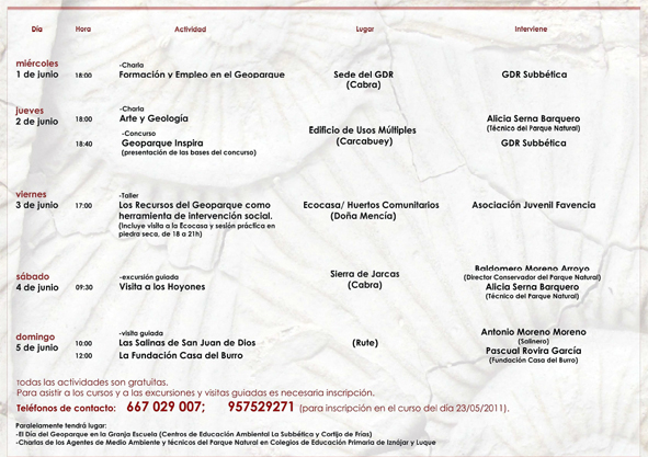 Todas estas actividades son gratuitas y de libre asistencia, aunque precisan de inscripción y en ellas colaboran difrentes instituciones euopeas, nacionales, regionales, comarcales y locales. Teléfonos de contacto: 609 029 007 y 957 529 271.