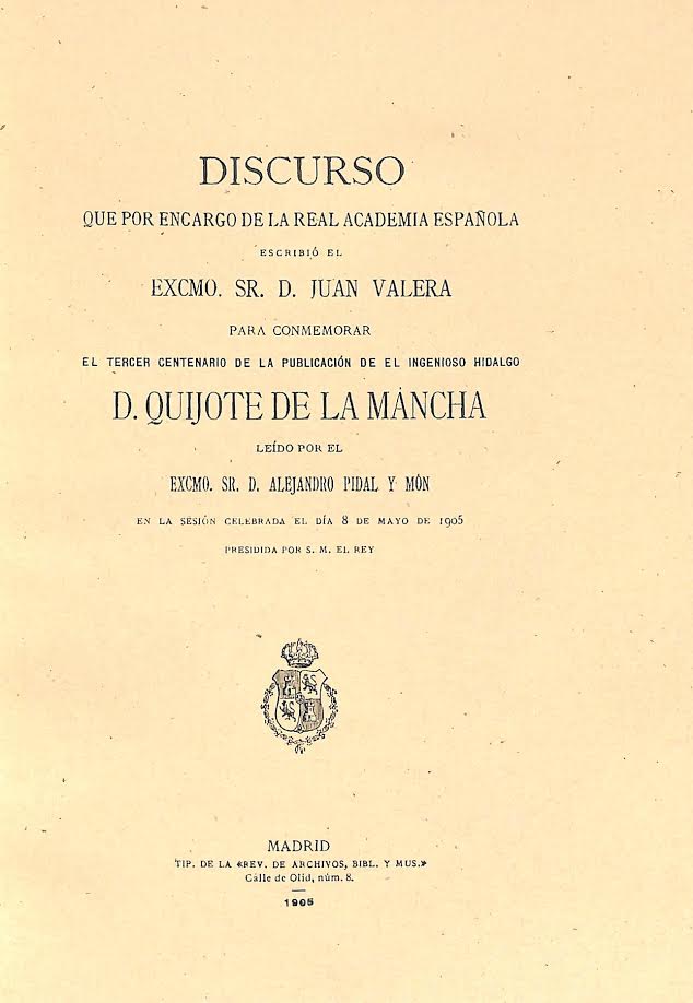 Discurso que por encargo de la Real Academia Española escribió el Sr. D. Juan Valera para conmemorar el tercer centenario de la publicación de el El ingenioso hidalgo D. Quijote de la Mancha / leído por el Sr. D. Alejandro Pidal y Món en la sesión celebrada el día 8 de mayo de 1905.-- Madrid : [s.n.], 1905 (tip. de la Rev. de archivos, bibl. y mus.)