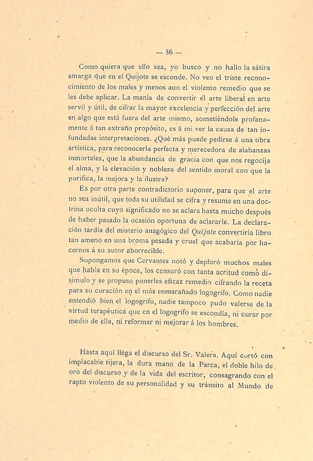 Transcribimos el último párrafo dictado a su secretario antes de que la mano de la Parca cortara el hilo de su discurso y de su vida: “Supongamos que Cervantes notó y deploró muchos males que había en su época, los censuró con tanta acritud como disimulo y se propuso ponerles eficaz remedio cifrando la receta para su curación en el más enmarañado logogrifo. Como nadie entendió bien el logogrifo, nadie tampoco pudo valerse de la virtud terapéutica que en logogrifo se escondía, ni curar por medio de ella, ni reformar ni mejorar a los hombres”.