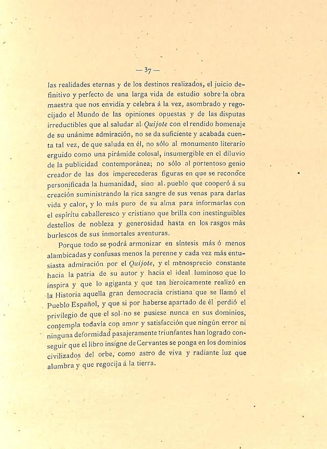 Nadie como él, reconocían, “encerraba en su fecundo seno la Academia con más títulos y mayor significación literaria para exponer, en acto tan solemne, el amor que anega todo pecho español y el entusiasmo en que se desborda al solo nombre de aquel libro en que aparece como cifrado todo el sublime contenido de la gloriosa civilización española”. Notorio era para todos, y así lo subrayan, que D. Juan Valera encarna “un espíritu libre y original, adiestrado en toda clásica disciplina, identificado con el genio literario español en sus formas más acendradas y castizas, abierto a todo viento de inspiración tanto nacional como extranjera y dotado de aquella difícil facilidad en la expresión serena y llana de las más transcendentales doctrinas que se iluminaban, al pasar por los bien cortados puntos de su pluma, con la clara y apacible luz meridional que limpia sin esfuerzo y como sin querer el ambiente de todo vago y malsano linaje de brumas y de nieblas”.