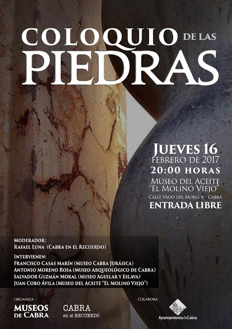 actualidad 14.02.17 Mesa redonda: COLOQUIO DE LAS PIEDRAS El próximo jueves, 16 de enero tendrá lugar en el Museo del Aceite "El Molino Viejo" de Cabra una mesa redonda que con el título de "COLOQUIO DE PIEDRAS" quiere incentivar el debate intelectual sobre nuestro patrimonio cultural con la participación de los representantes de Museos de Cabra. Moderado por Rafael Luna Leiva, representante del proyecto cultural "Cabra en el Recuerdo", intervendrán: Francisco Casas Marín por parte del "Museo Cabra Jurásica", Antonio Moreno Rosa por el "Museo Arqueológico", Salvador Guzmán Moral por el "Museo Aguilar y Eslava" y Juan Cobo Ávila por el "Museo del Aceite -El Molino Viejo-.