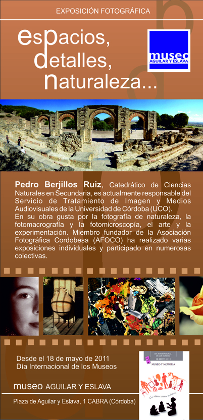 actualidad 19.05.11 Exposición fotográfica con motivo del Día Internacional de los Museos En la tarde del miércoles 18 de mayo se inauguró en el Museo Aguilar y Eslava la exposición de fotografía que lleva por título «Espacios, detalles y naturaleza», cuyo autor es Pedro Berjillos Ruiz, catedrático de ciencias naturales y responsable del departamento de tratamiento de imagen y medios audiovisuales de la Universidad de Córdoba (UCO).