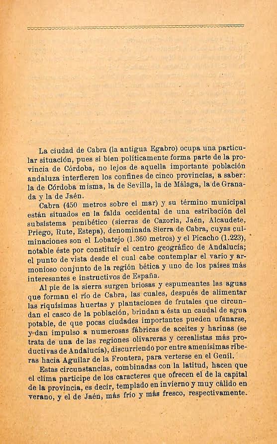 En la introducción del trabajo, incluido en una serie dedicada a instituciones modelo, enfatiza en su breve preámbulo sobre la situación de Cabra (la antigua Egabro, dice), siendo muy particular la encrucijada que sitúa la ciudad entre sus “bien cuidadas carreteras” que enlazan con las “numerosas, prósperas e importantísimas poblaciones que la circundan en un radio de 40 kilómetros: Lucena, Aguilar, Montilla, Espejo, Castro, Baena, Carcabuey, Priego, Rute, etc.”, lo que hace que estas poblaciones sumen un total aproximado de 160.000 habitantes.