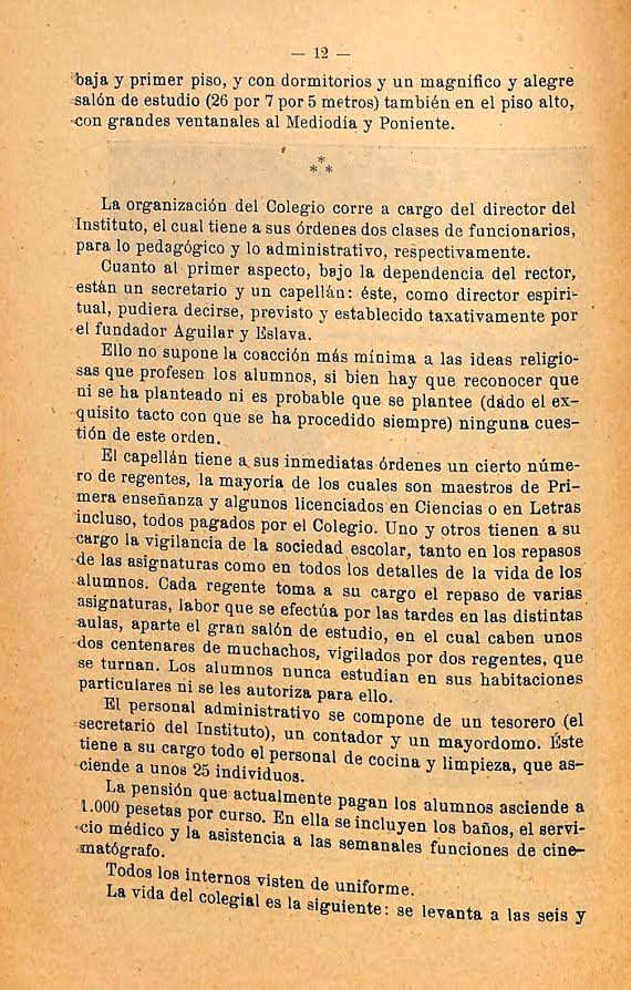 A 1.000 pesetas ascendía la pensión que debían abonar los alumnos por curso. En ella se incluían “los baños, el servicio médico y la asistencia a las semanales funciones de cinematógrafo”. Los internos visten todos de uniforme, siendo la vida del colegial la siguiente: “Se levanta a las seis y media de la mañana. Estudio hasta las ocho. A las ocho y media, desayuno, consistente en un huevo frito, tejeringos y un vaso de leche y café. A las nueve, hasta la una y media, las clases en el Instituto. A las dos menos cuarto, comida: sopa, cocido, principio, ensalada y postres (cada cinco días comida extraordinaria). A las dos y cuarto, hasta las tres, juego en el patio del Colegio o paseo por el parque inmediato (en lo sucesivo, juego en el parque deportivo del Colegio, a 150 metros de éste). De tres a cuadro, estudio. De cuatro a cinco y media, paseo o juego, salvo los alumnos de turno, para tomar el baño, a cuyo efecto funcionan la caldera central y los radiadores, hasta las ocho de la noche. De cinco y media a siete y media, estudio, con un intervalo de diez minutos a las seis y media. A las siete y media, cena: dos principios, ensalada y postre”. Aclaremos que “principio” es el alimento que se servía entre la olla o el cocido y los postres. Los regentes y el capellán comen con los alumnos, “atentos siempre a la disciplina y a la mayor corrección de aquéllos”.