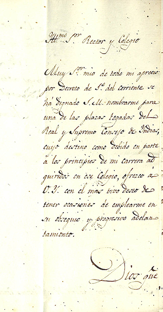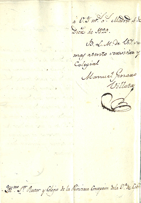 “Muy Sr. mío de todo mi aprecio: por decreto de 1.º del corriente se ha dignado S. M. nombrarme para una de las plazas togadas del Real y Supremo Consejo de Indias, cuyo destino como debido en parte a los principios de mi carrera adquiridos en ese Colegio, ofrezco a V. I. con el más vivo deseo de tener ocasiones de emplearme en su obsequio y progresivo adelantamiento. Dios guarde a V. I. muchos años. B. L. M. de V. I. su más atento servidor y colegial Manuel Genaro Villota”. De su puño y letra es “Beso la mano…”, y, por supuesto, la firma.