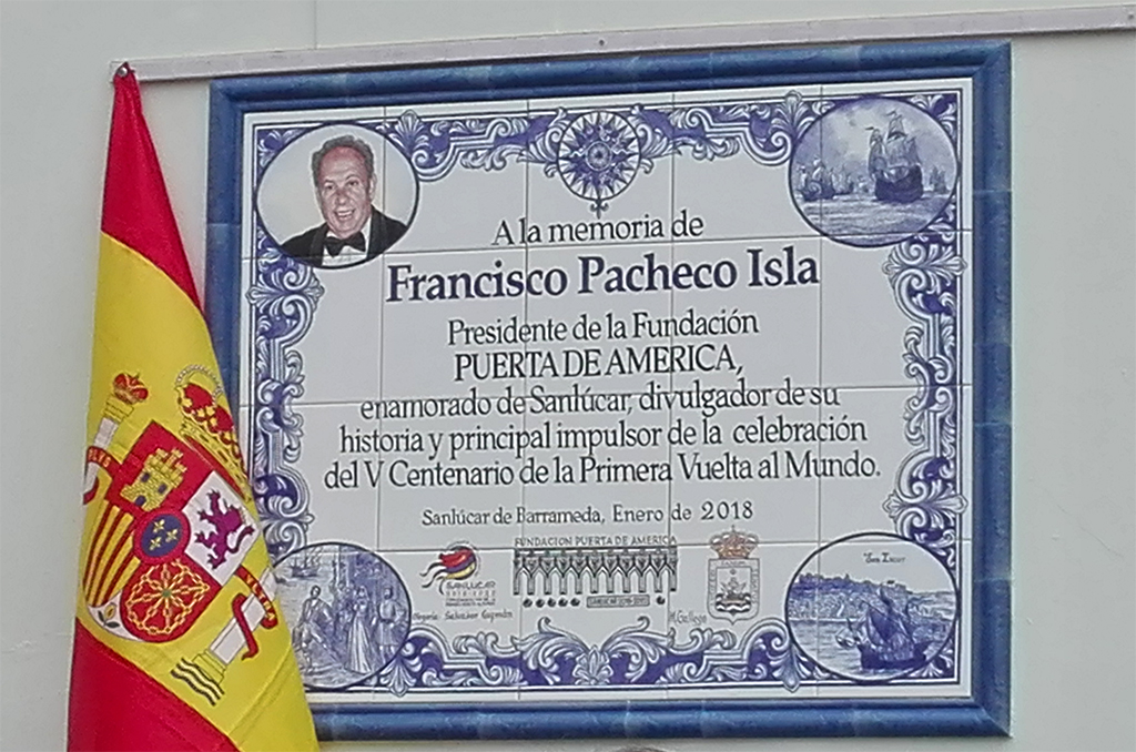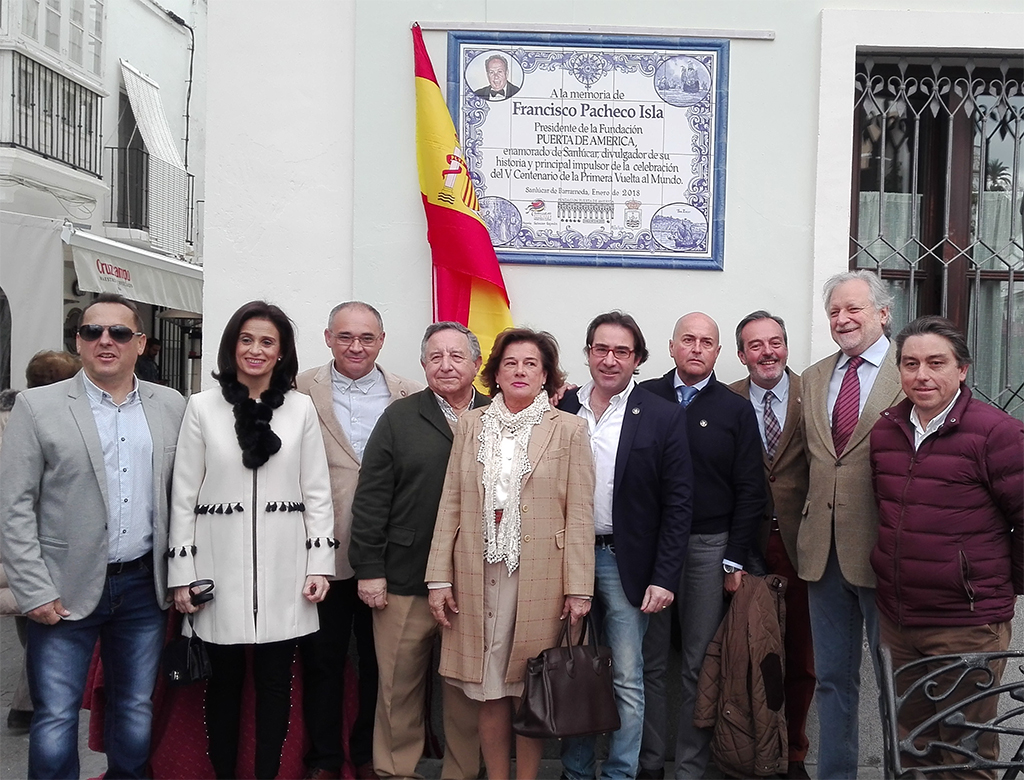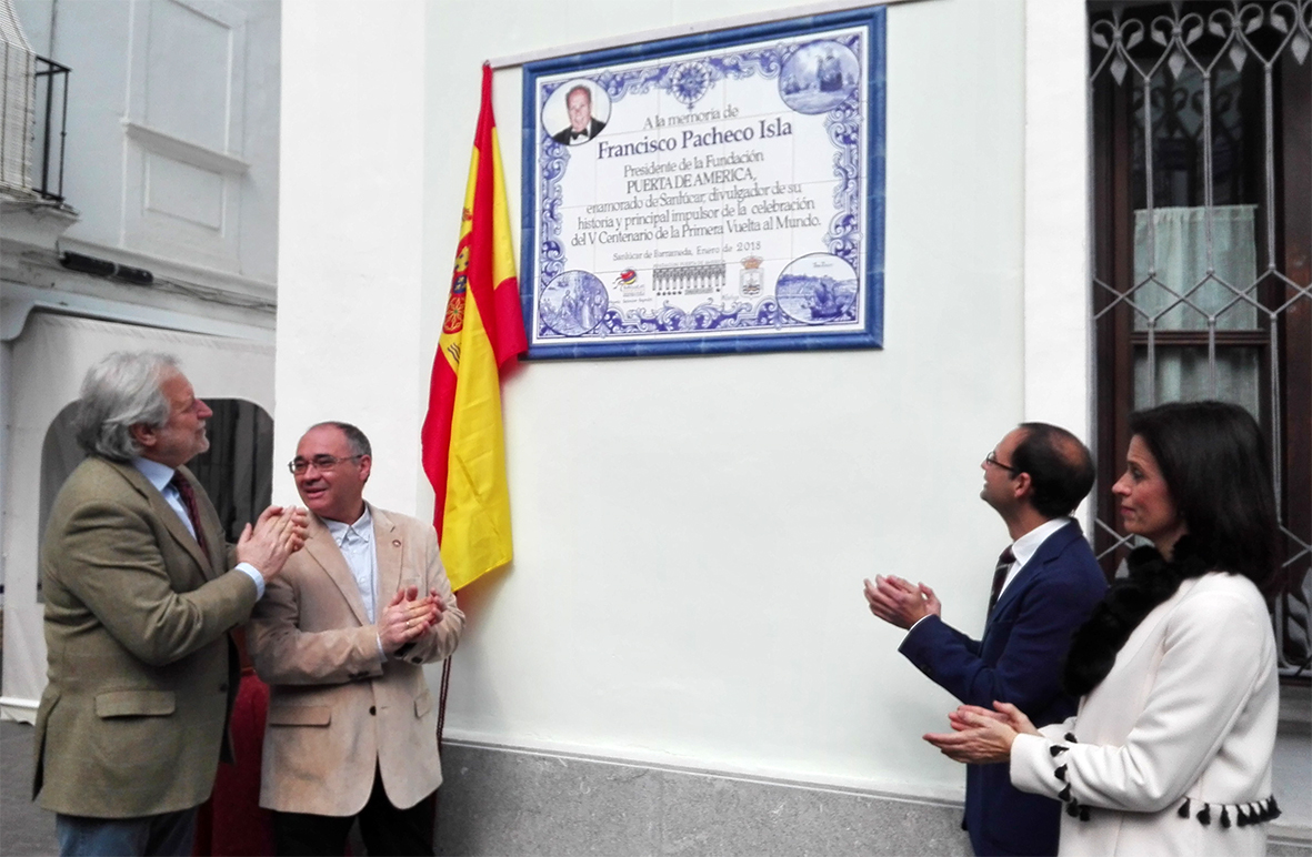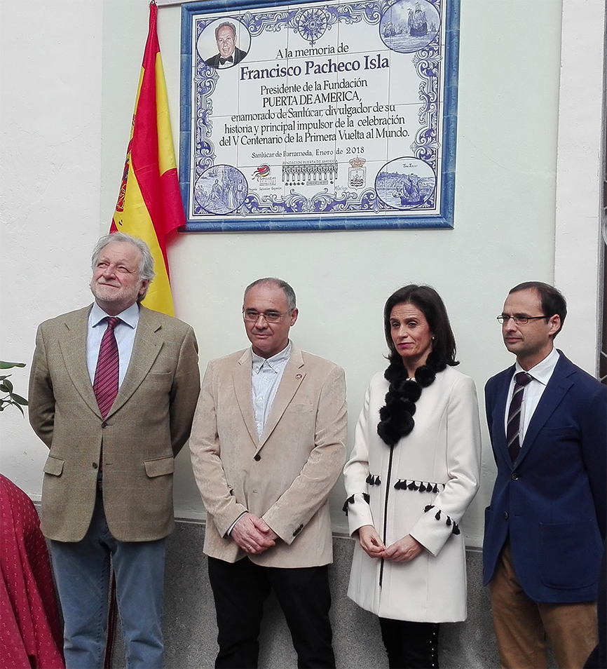 actualidad 25.02.18 Un azulejo recuerda a Francisco Pacheco como impulsor del V Centenario de la Primera Vuelta al Mundo en Sanlúcar de Barrameda El sábado, 24 de febrero tuvo lugar la inauguración de un azulejo conmemorativo en la plaza de San Roque de Sanlúcar de Barrameda (Cádiz), con el que la Fundación Puerta de América y el Ayuntamiento de Sanlúcar rinden homenaje a Francisco Pacheco Isla, que fuera presidente de la entidad en la que también participa la Fundación Aguilar y Eslava.