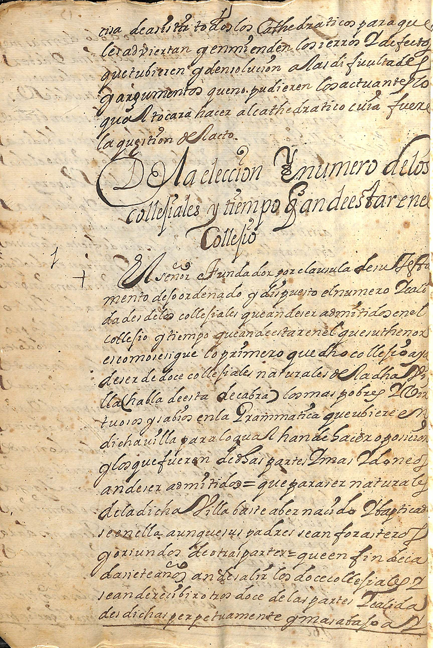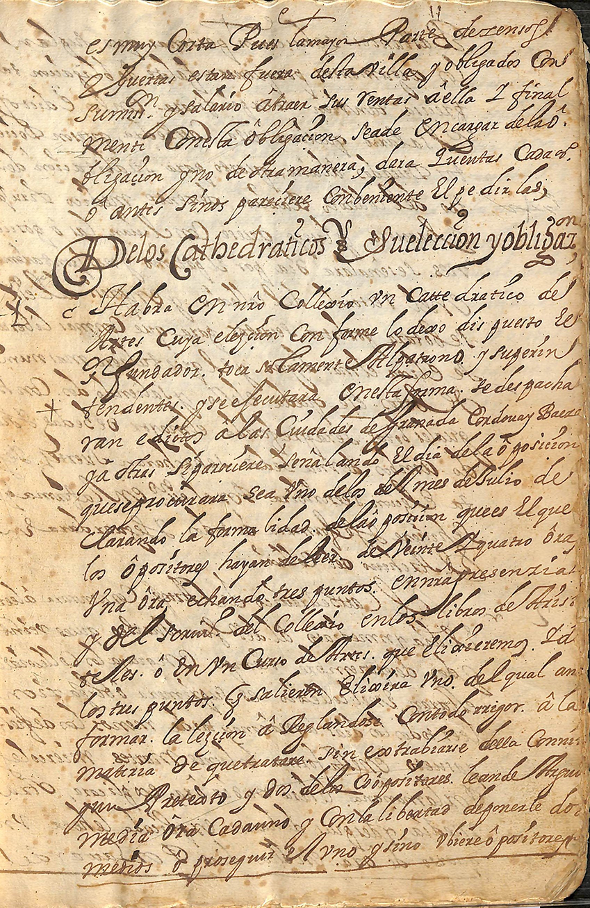 Siete apartados comprenden el título “De los catedráticos y su elección y obligación”, cuyo nombramiento corresponde solamente al patrono y superintendentes. Se despacharán edicto “a las ciudades de Granada, Córdoba y Baeza y otras si pareciere”. Aparte de detallar sus compromisos, entre ellas está la siguiente: “En saliendo de la clase a mañana y tarde, tendrá un cuarto de hora de “portel” para que sus discípulos le pregunten las dudas que tuvieren”.