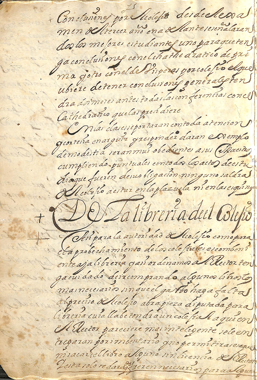 En el apartado de los libros indican que para el aprovechamiento de los alumnos es conveniente que haya librería, estando a su cuidado el rector. Los libros serán los más necesarios “sin que el gasto haga falta al preciso del Colegio”. La llave de la librería la tendrá quien al rector “pareciere más inteligente”. Los libros se sacarán cuando sean necesarios y con permiso del rector. Si algún libro “se perdiere o viniere deteriorado” se hará pagar multándolo en alguna cantidad para ayuda de libros o bien con castigo. En un artículo que publicamos el pasado año se aludía a un inventario de 1710 en el que figuraban 74 libros (49 impresos y 25 manuscritos) que ocupaban espacio en un estante de pino con seis tablas y cinco huecos.
