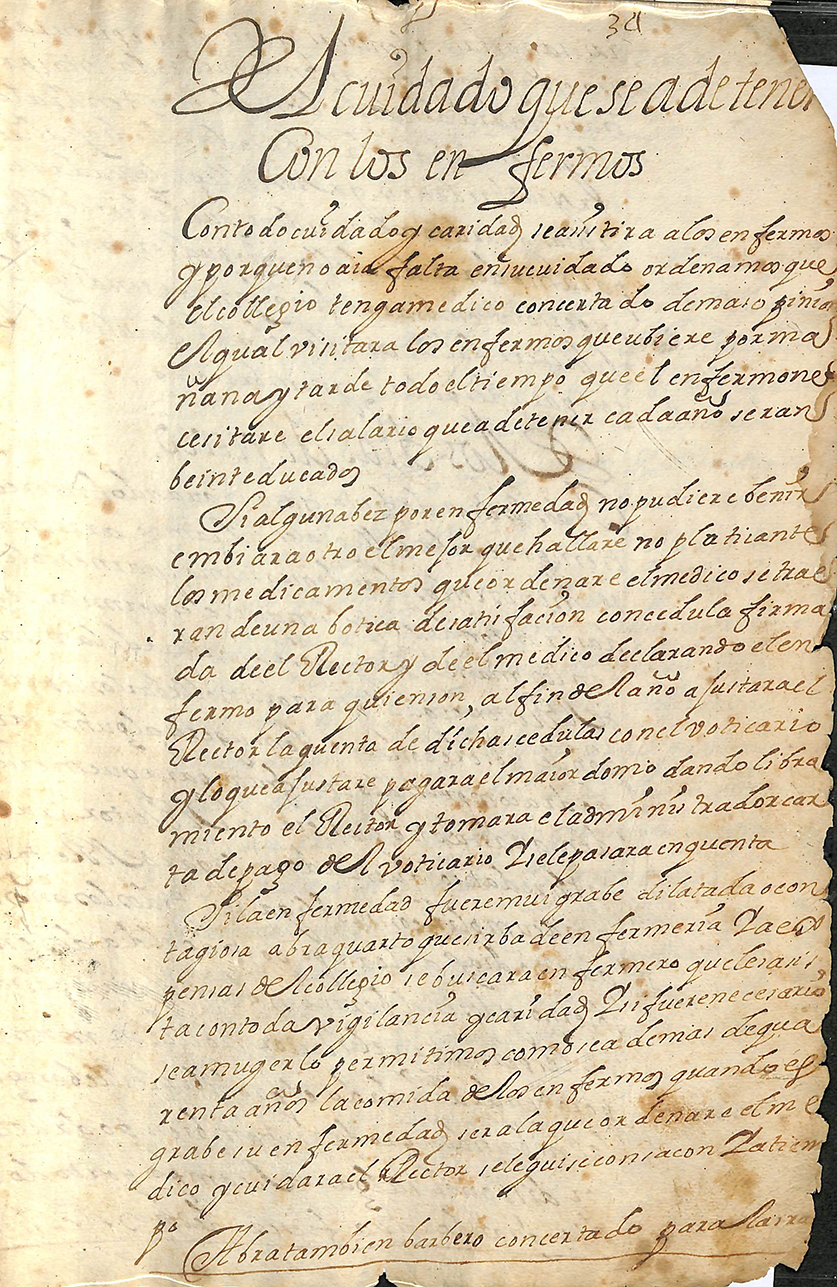 El “rasurero” se encarga “de traer agua en el escalfador y prevenir los paños y asientos en la parte donde se hiciere la rasura”. Del “enfermero” se expone que el rector procurará que “sea el más caritativo para darle de comer, prevenir la bebida, limpiar el aposente, hacer la cama, atender a lo que el médico mandare”. Asistirá a los enfermos un médico nombrado por la Junta del Patronato. Habrá otro colegial señalado para dar y recibir la ropa blanca, manteles, servilletas, paños de cocina que ha de llevar a la lavandera. Tendrá su libro “de cuenta y razón” de la ropa que entrega.