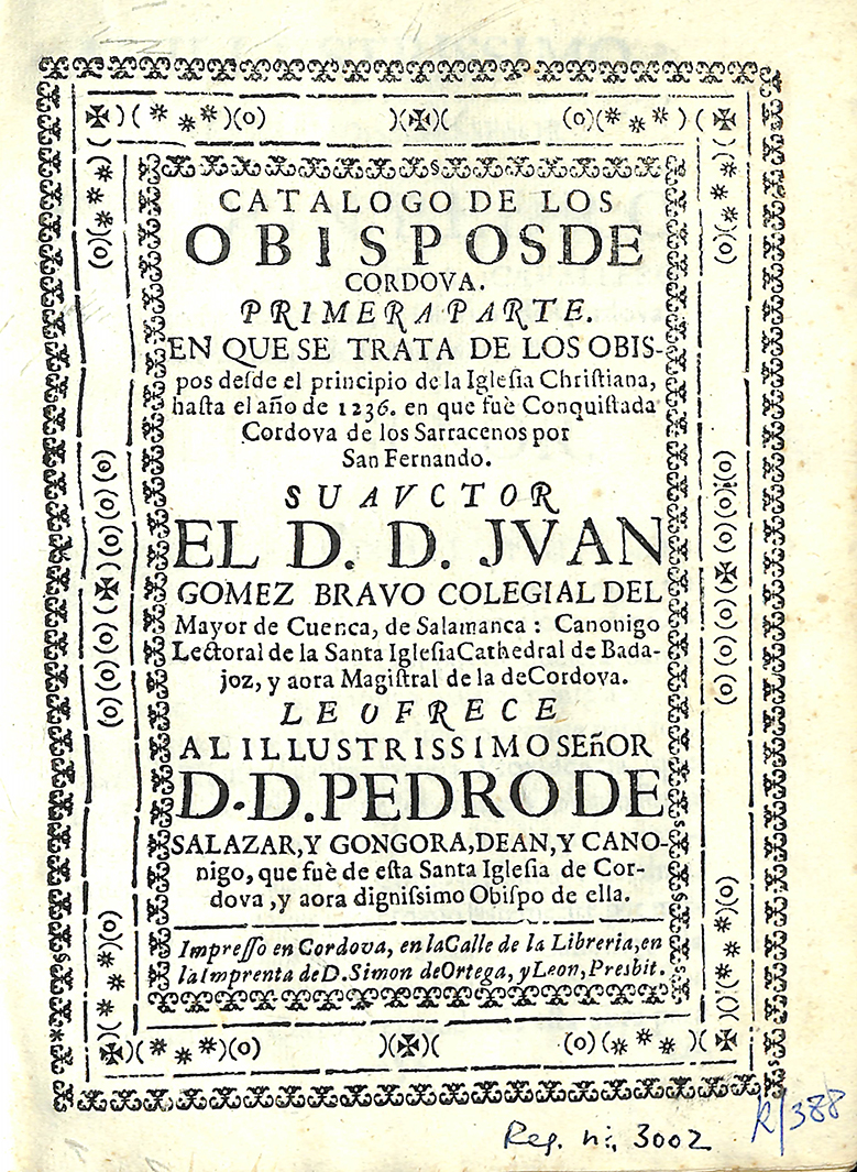 Catálogo de los Obispos de Cordoua : primera parte, en que se trata de los Obispos desde el principio de la Iglesia Christiana hasta el año de 1236, en que fue conquistada Cordova de los sarracenos por San Fernando / su auctor ... Iuan Gómez Bravo.-- Impresso en Córdoua : en la calle de La Librería, en la imprenta de D. Simón Ortega y León ..., [s.a.]
