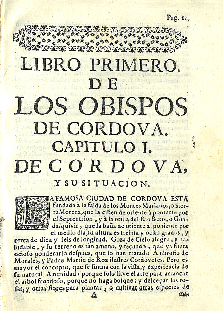 Esta primera parte se compone de dos libros. El primero, dividido en ocho capítulos, se inicia con la fundación de Córdoba y su situación a la orilla del río Betis o Guadalquivir. En los títulos de los capítulos se destacan los obispos Severo, Osio, Higinio, Gregorio, Isidoro, Esteban, Agapio, Eleuterio, Juan (Obispo de Cabra), Agapito, Honorio, otro de Cabra (innominado), Leudefredo, Deodato (de Cabra), Euforo, Mumulo, Zacheo y los de Cabra: Bacauda, Gratino, Constantino y Arcesindo.