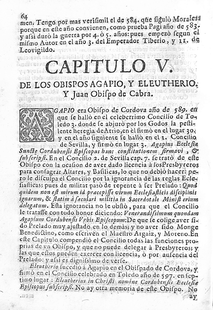“Año de Cristo 863”. Escribe: “Comprendía entonces el Obispado de Córdoba hasta el río Guadiana, que finalizaba la Bética de la Lusitania y Obispado de Mérida, y por la campiña gozaba casi de todo lo que hoy tiene, excepto Cabra y Palma”.