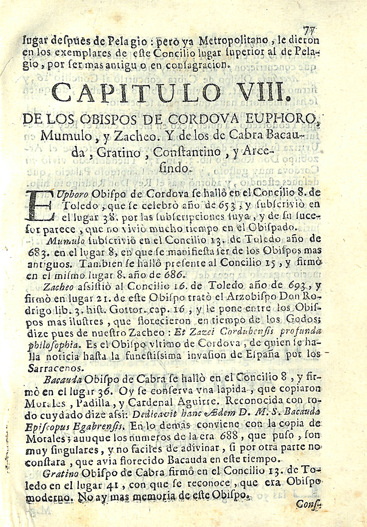 CONSTANTINO, obispo de Cabra, “se halló en el XV Concilio de Toledo [688] y subscribió en el lugar 61, que es el último de los obispos que concurrieron, y así era muy moderno en el obispado”.