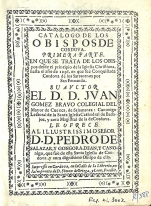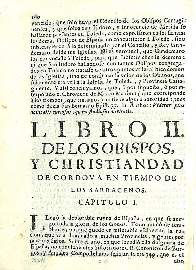 El texto que figura en la portada de nuestro LIBRO DESTACADO es “Catálogo de los obispos de Córdoba. Primera parte, en que se trata de los obispos desde el principio de la Iglesia Cristiana hasta el año de 1236 en que fue conquistada Córdoba de los sarracenos por San Fernando”. El escritor es Juan Gómez Bravo, colegial del Mayor de Cuenca, de Salamanca, canónigo lectoral de la Santa Iglesia Catedral de Badajoz y en el momento de la divulgación magistral de la de Córdoba.
