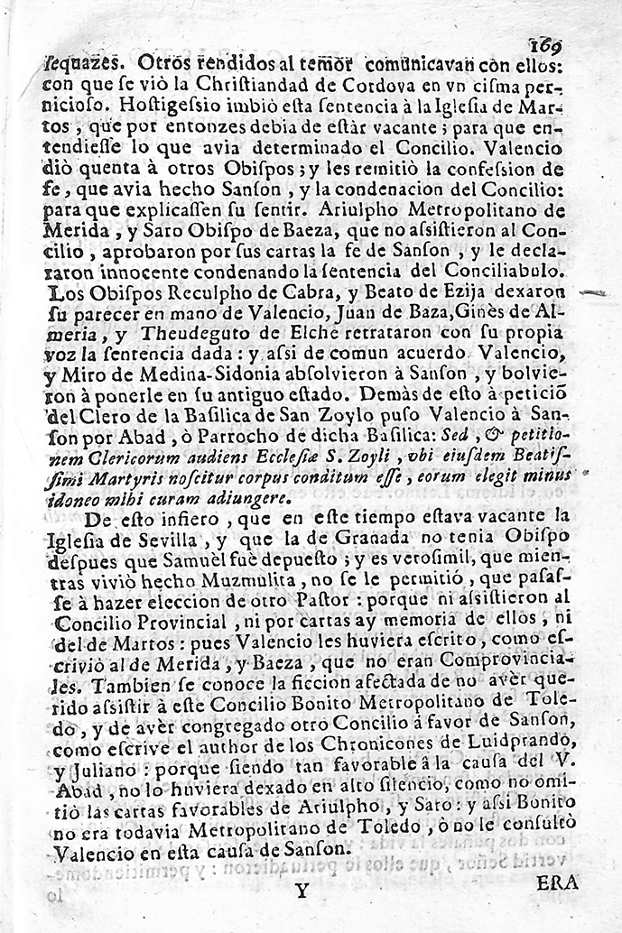 “Año de Cristo 862”. Ubica un cónclave en Córdoba: “El Concilio se compuso de los obispos inmediatos y de los que se hallaban en la Corte, que fueron Valencio de Córdoba, RECULFO de Cabra, Beato de Écija, Juan de Baza, Ginés de Almería Teudeguto de Elche, Miro de Medina-Sidonia y Hostigesio de Málaga. Viendo Sansón la próxima tempestad que le amenazaba, tres días antes de congregarse el Concilio dio a cada obispo un escrito que contenía su confesión de la Fe”.