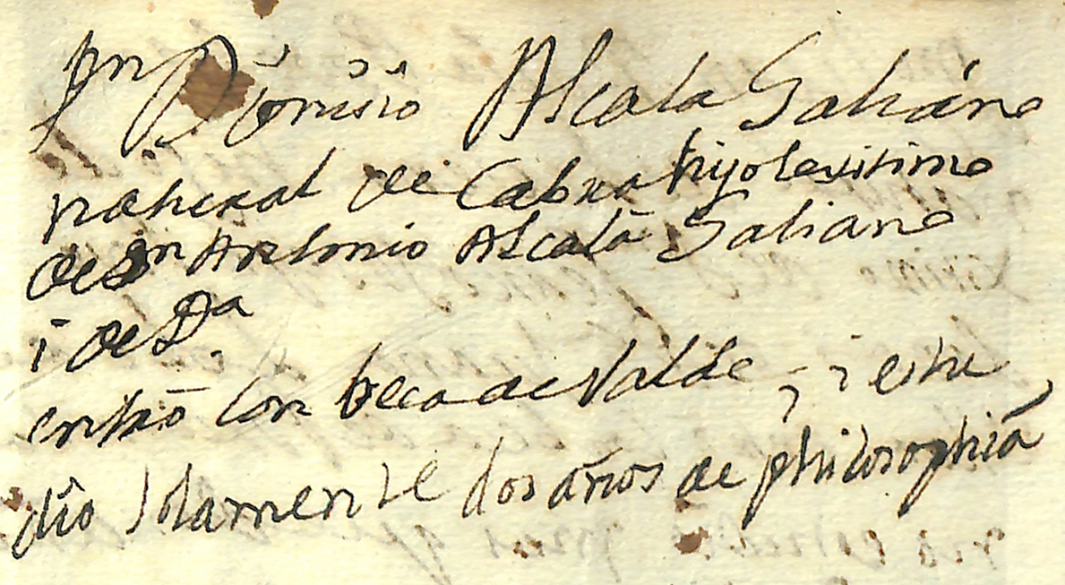 Efectivamente, en el folio 32 esta mención: “Don Dionisio Alcalá Galiano, natural de Cabra, hijo legítimo de Don Antonio Alcalá Galiano y de Doña [aparece un espacio en blanco] entró con beca de balde y estudió solamente dos años de Filosofía”.