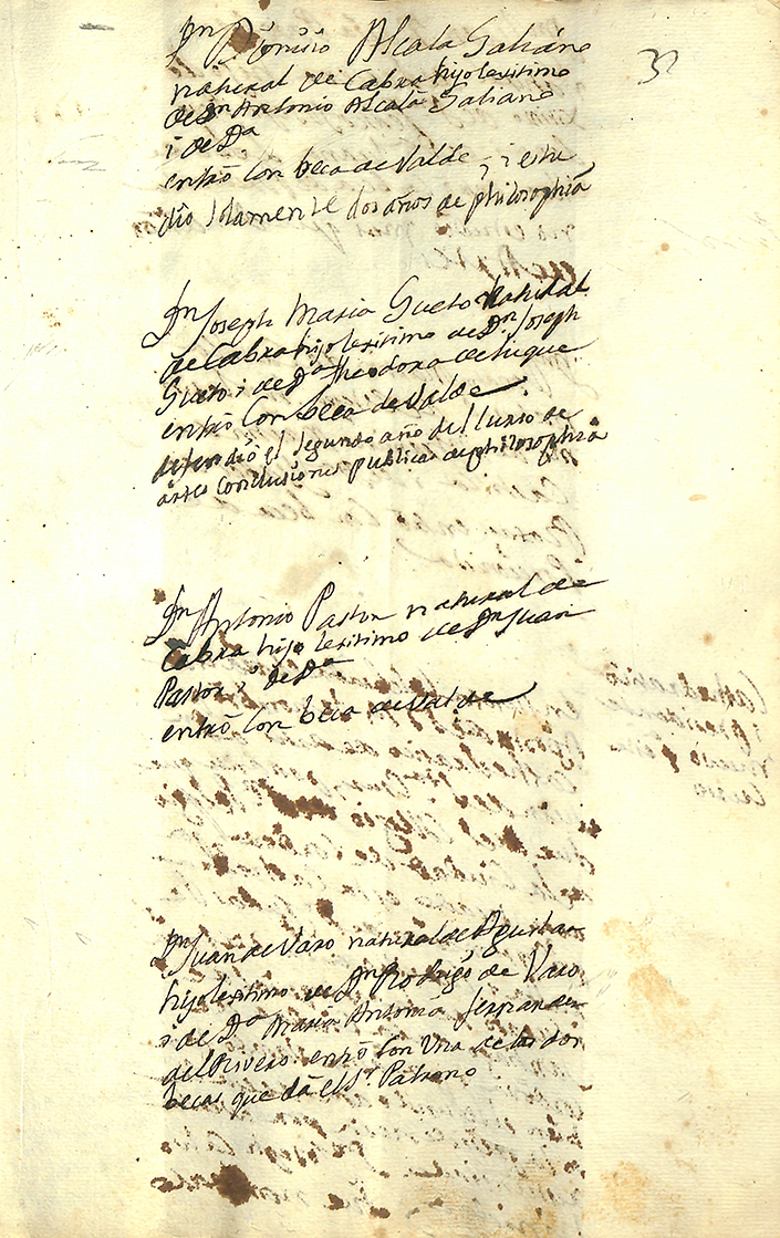 Siguiendo nuestra investigación, intentamos localizar el aprovechamiento del primer año de estudios de Dionisio, que queda reflejado en el acta del 14 de mayo de 1773. Junta de Gobierno en el cuarto rectoral con el patrono de sangre, superintendentes, rector, catedráticos de prima, de vísperas y de arte, así como del presidente, para proceder a los exámenes. Aparece una relación de los estudiantes de teología y otra de los de filosofía. Esta última la reproducimos literalmente: