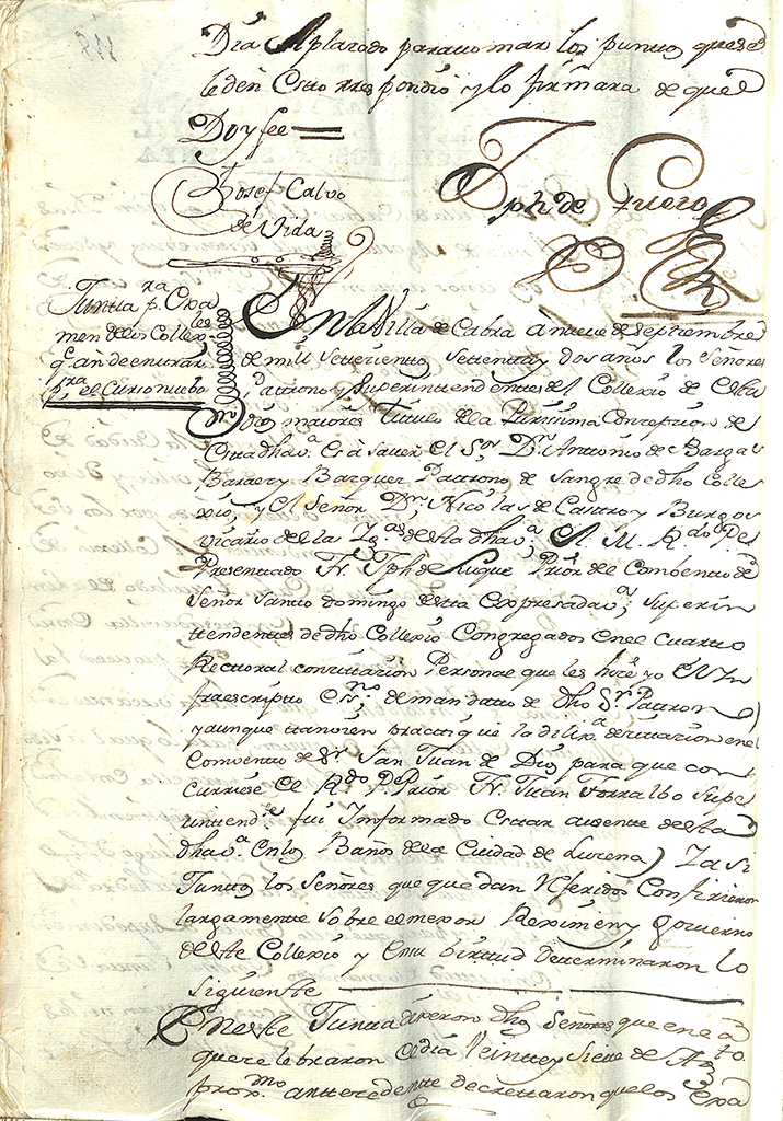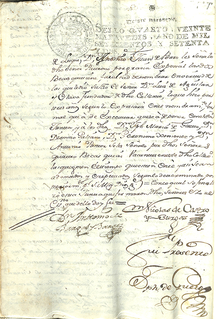 A D. Pedro Ignacio de Luque y a D. Antonio Juan de Varo les correspondieron las dos becas señaladas por al patrono de sangre, facultad que tiene en virtud dada por su tío D. Luis de Aguilar y Eslava, fundador del Colegio, lo que hizo por tres años, y “a los dichos D. José María de Güeto, D. Dionisio Galiano, D. Jerónimo Jiménez y D. Antonio Pastor se les señaló por dichos señores cuatro becas que hay vacantes en este dicho Colegio, las que gocen de tiempo que estén en él y así sean admitidos y aceptados según lo determinado posteriormente por S.M. q. D. g., con lo cual se finalizó esta Junta que firmaron dichos señores”. Las rúbricas recogidas son las de D. Antonio de Vargas y Baráez, D. Nicolás de Castro y Burgos y la del escribano José de Güeto, que da fe.