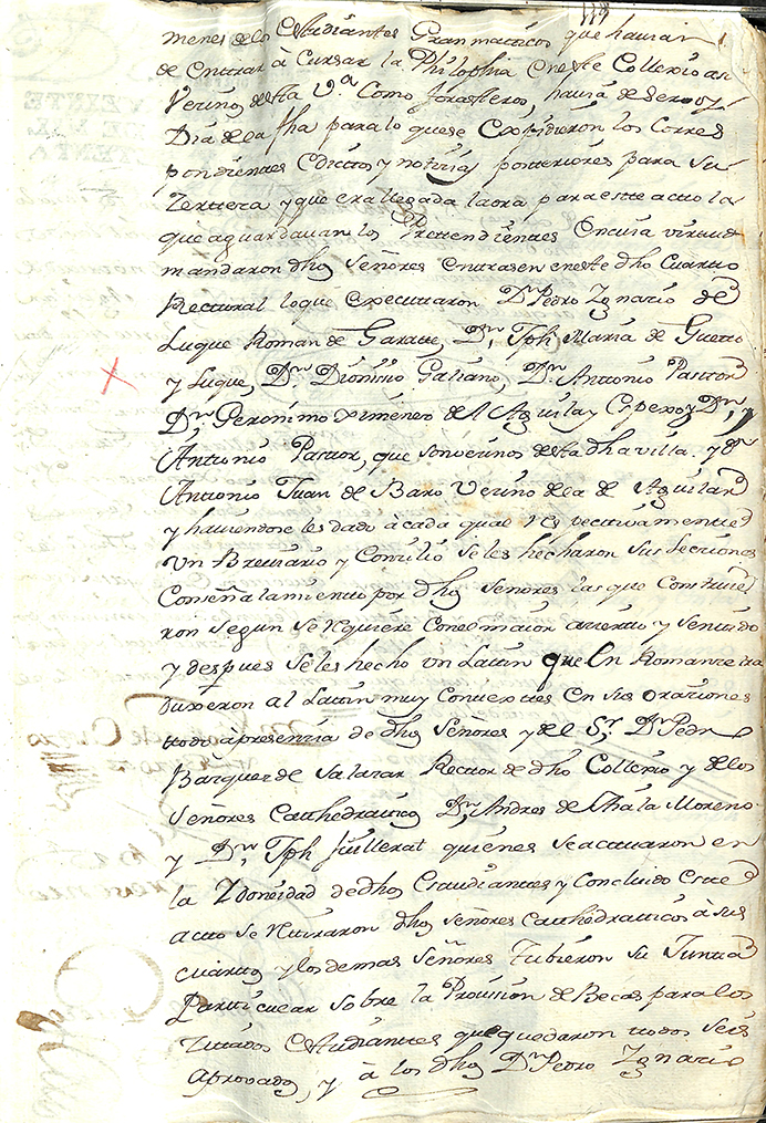 Se detalla que “habiéndoseles dado a cada cual respectivamente un breviario y concilio se le echaron sus lecciones con señalamiento por dichos señores, las que construyeron, según se requiere, con el mayor arresto y sentido”. En la siguiente prueba “se les echó un latín que en romance tradujeron al latín, muy con textos en sus oraciones; todo a presencia de dichos señores y de D. Pedro Vázquez de Salazar, rector de dicho Colegio y de los señores catedráticos D. Andrés de Ayala Moreno y D. José Fuillerat, quienes se actuaron en la idoneidad de dichos estudiantes”. Una vez concluido el acto, los señores catedráticos se retiraron a sus cuartos y “los demás señores tuvieron su junta particular sobre la provisión de becas para los citados estudiantes”. Todos quedaron aprobados.
