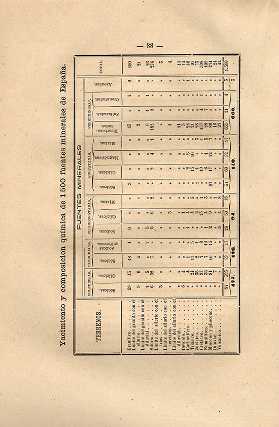 Se acompaña un censo general de las aguas minerales de España y estadísticas de resultados clínicos (1876 y 1877), administrativos o condición social de los concurrentes a los establecimientos. Hay un apartado dedicado a las fuentes minerales en sus relaciones con la economía política, su influencia en la cultura y en la riqueza pública. En las últimas páginas de esta primera parte presentan unas consideraciones generales sobre el estado actual de los establecimientos balnearios de España y los medios de favorecer su progreso y desarrollo. En ellas se incluyen detalles sobre instalaciones, comodidades, distracciones, medios de comunicación, etc.