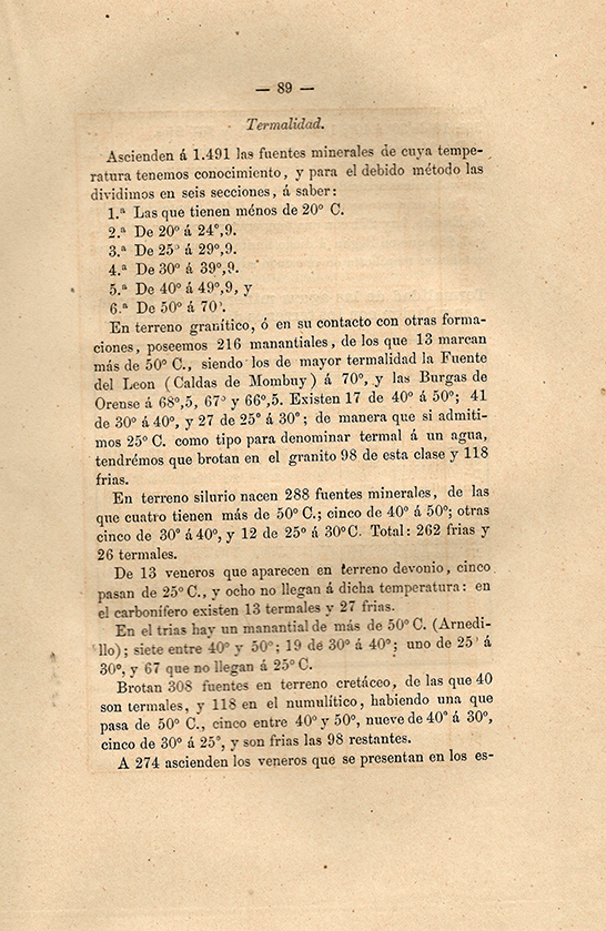 La segunda parte del ANUARIO es una descripción de los establecimientos de aguas y baños minerales de España. Se acompaña de las memorias e informes anuales que escriben los médicos-directores de los mismos, exteriorizando la necesidad de que se adopte un método común a todos ellos. Se describen los establecimientos de aguas sulfurosas sódicas y sulfurosas cálcicas; los de aguas cloruradas sódicas y sulfurosas; los de aguas bicarbonatadas sódicas, cálcicas y mixtas; los de aguas sulfatadas sódicas, cálcicas, magnésicas y mixtas. Incluyen los de aguas ferruginosas bicarbonatadas. La tercera y última parte está consagrada a la legislación vigente en aquellas fechas. Seleccionamos a continuación los dos aludidos al principio: