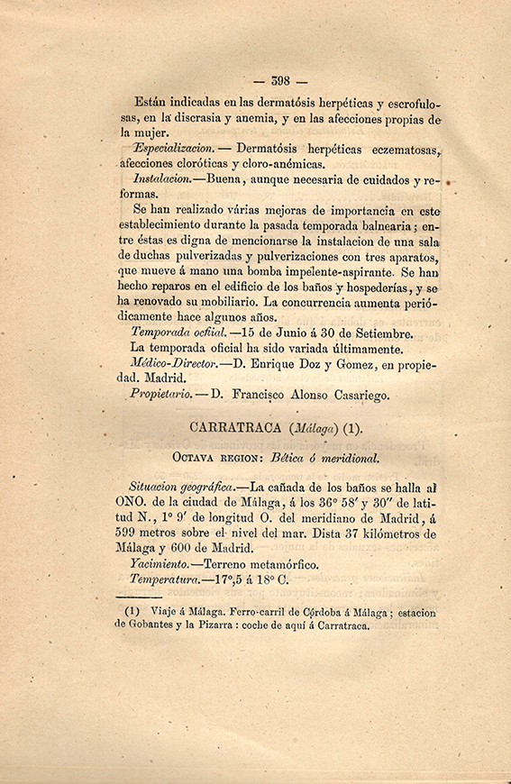 DATOS espigados. Situación geográfica: Dista 37 kilómetros de Málaga y 600 de Madrid. Yacimiento: Terreno metamórfico. Caracteres físicos: El agua de Carratraca es incolora y diáfana. Caudal: 500 litros por minuto. Clasificación de aguas: Sulfuradas cálcicas. Estadística terapéutica: Enfermedades de la mujer 1.107, Dermatosis 708. Estadística clínica: 487 curados, 2.207 aliviados y 421 sin alivio. Estadística administrativa: Enfermos de la clase acomodada 2.348, de la clase pobre 761 y de la clase de tropa 10. Mayoría de procedencia: Provincia de Málaga, Sevilla, Córdoba y Madrid. Mayoría de concurrencia: Enfermedades de la mujer y dermatosis. Especialización: Lesiones de la matriz, metrítis crónicas y parenquimatosas, ulceraciones, catarros uterinos y vaginales, úlceras herpéticas y escrofulosas. Instalaciones: Buena. Se hacen necesarias reformas en el régimen y captado de aquellas ricas y abundantes fuentes. El establecimiento es bueno y los bañistas se alojan en las casas del pueblo de Carratraca, donde existen numerosas fondas y casas de huéspedes. Temporada oficial: 15 de junio a 30 de septiembre. Médico-Director: Enrique Doz y Gómez, en propiedad, Madrid. Propietario: Francisco Alonso Casariego.