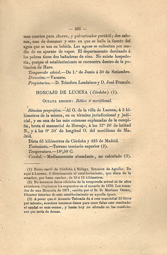 DATOS espigados. Situación geográfica: Dista 65 kilómetros de Córdoba y 425 de Madrid (Ferrocarril de Córdoba a Málaga, Estación de Aguilar; de aquí a Lucena, o directamente al establecimiento, que dista de la estación, por buen camino, de 10 a 12 kilómetros). Yacimiento: Terreno terciario superior. Temperatura: 18º,50 C. Caudal: Medianamente abundante, no calculado. Caracteres físicos: El agua es clara, transparente, de olor fétido y sabor desagradable, desprende alguna burbuja gaseosa. Clasificación: Clorurado-sódicas-sulfurosas. Estadística clínica y terapéutica (enfermedades): Herpetismo y sus manifestaciones, metrorragias, dismenorreas y leucorreas, neuralgias y oftalmías. Estadística administrativa de 1876 sobre 208 personas: Enfermos de clase acomodada 186, de clase pobre 17, de la clase de tropa 4. Estadística clínica y terapéutica de un total de 288: Curados 79, aliviados 96 y sin resultado 19.