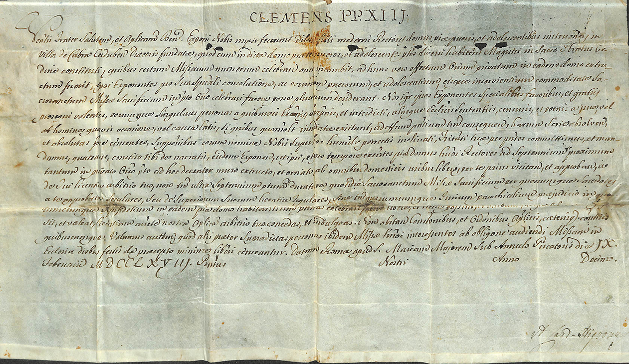 Breve apostólico de Clemente XIII concediendo licencia para la celebración del Santo Sacrificio de la Misa en el oratorio del Real Colegio (Roma, 9 de febrero de 1768).