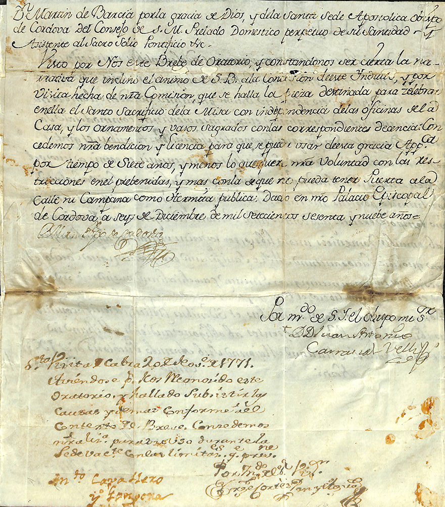 En el reverso de la autorización se recogen diversas diligencias que actualizan la concesión, como la del 6 de diciembre de 1769 dada en el Palacio Episcopal de Córdoba: “Don Martín de Barcia por la gracia de Dios y de la Santa Sede Apostólica, obispo de Córdoba, del Consejo de S. M., prelado doméstico perpetuo de Su Santidad y asistente al Sacro Solio Pontificio.