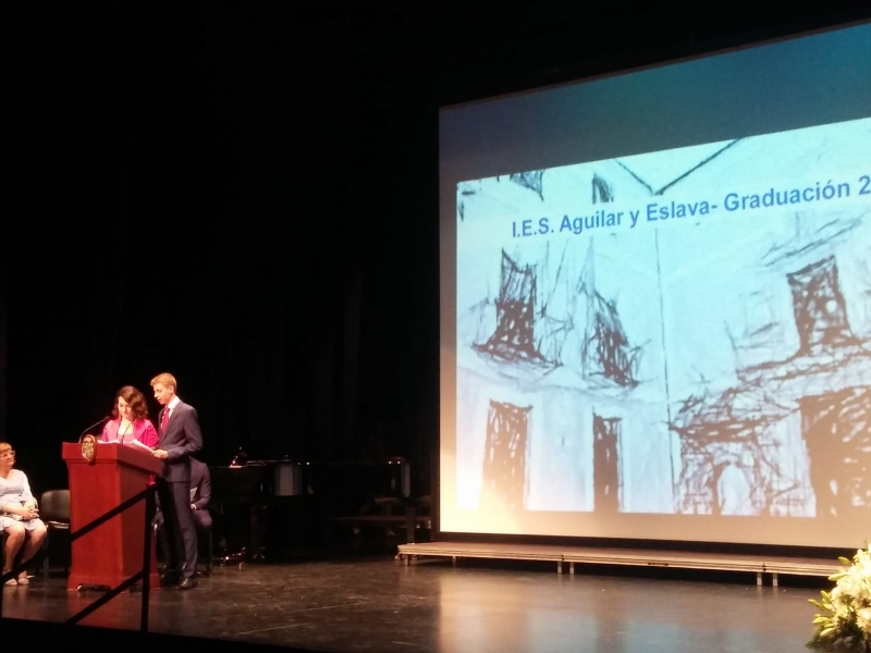 actualidad 29.05.18 Acto académico de graduación 2018 El Jueves, 24 de mayo en el Teatro El Jardinito, el alumnado de los distintos grupos de bachillerato y ciclo formativo participaron, un año más, en el acto académico de graduación con el que finalizan sus estudios en el I.E.S. "Aguilar y Eslava" de Cabra. El acto estuvo presidido por el delegado municipal de Educación, Ángel Moreno; el director del Instituto Aguilar y Eslava, Francisco Ortiz; el presidente de la Fundación Aguilar y Eslava, Salvador Guzmán y por el profesor Jesús Rodríguez, en representación del claustro de profesorado.