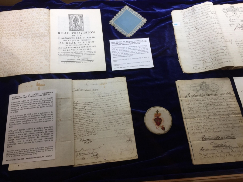 actualidad 05.06.18 Exposición: Documentos vinculados al Oratorio/Capilla de la Fundación Aguilar y Eslava Con motivo de la inauguración del ORATORIO DE LA PURÍSIMA de la Fundación Aguilar y Eslava se ha organizado, en dicha capilla y en diversas vitrinas, una exposición con documentos del Archivo del Real Colegio vinculados a lo que ha sido la historia de este espacio religioso en el centro educativo desde su inicio en el siglo XVII, aunque el lugar de su ubicación ha sido a lo largo de los años en distintos sitios del edificio.